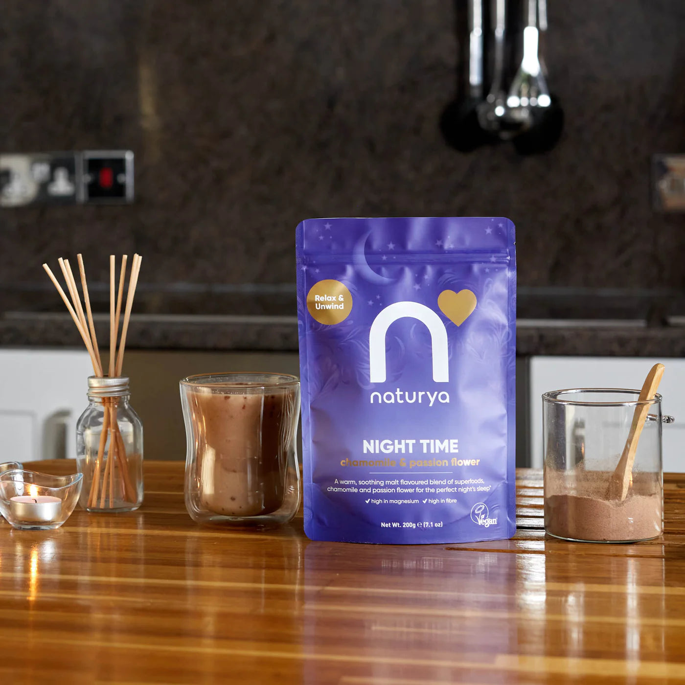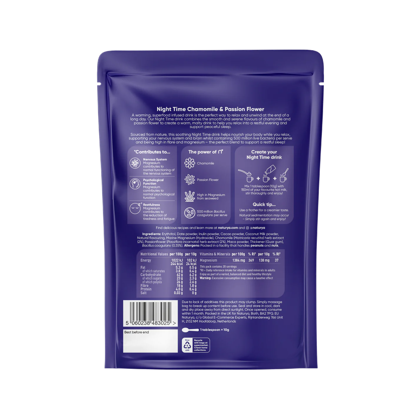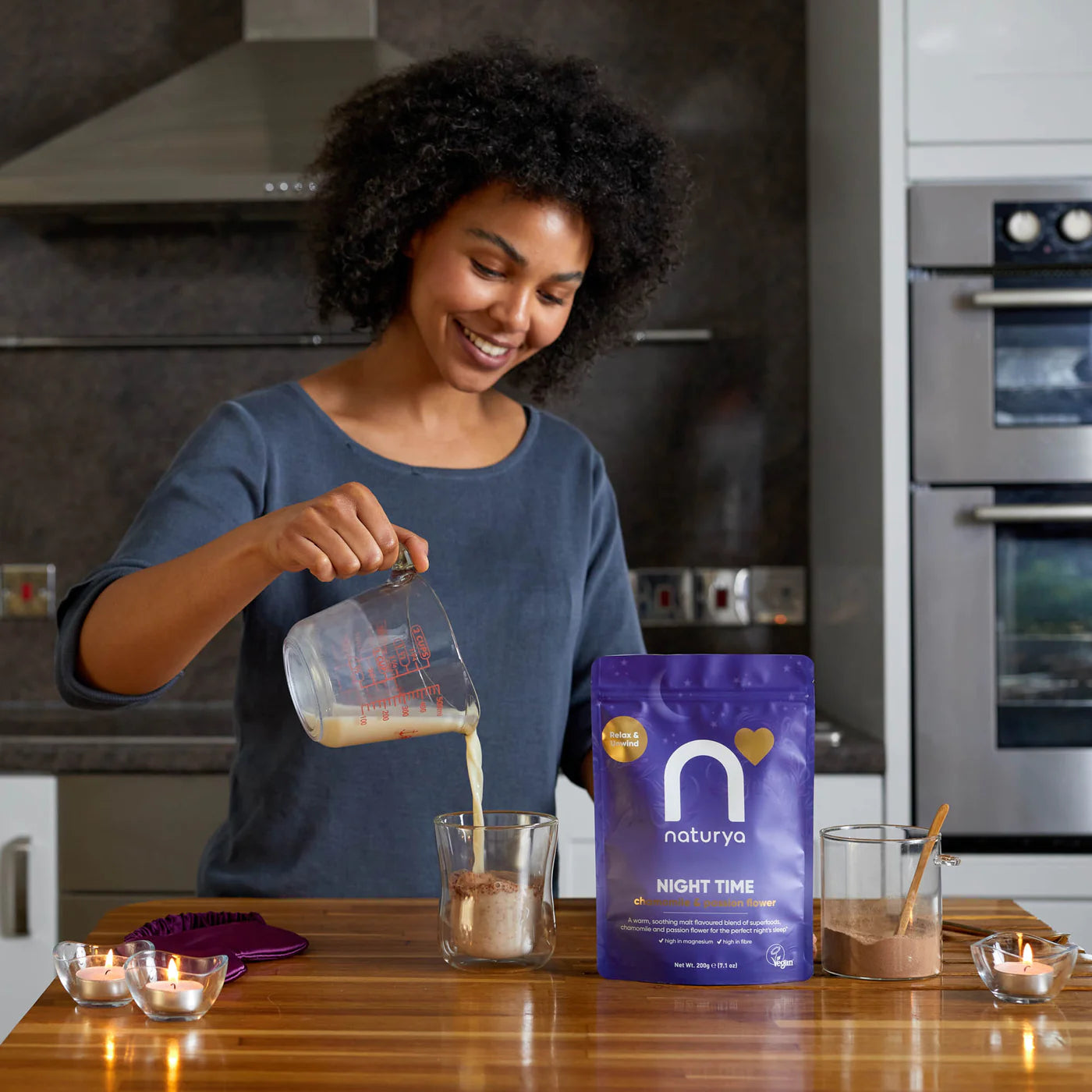 Teplý nápoj obohacený superpotravinami je ideálním způsobem, jak se uvolnit a odpočinout na konci dlouhého dne. Nápoj Night Time od značky Naturya kombinuje jemné a klidné chutě heřmánku a vášnivky, čímž vytváří teplý, sladký nápoj, který vám pomůže uvolnit se do klidného večera a podporovat klidný spánek.